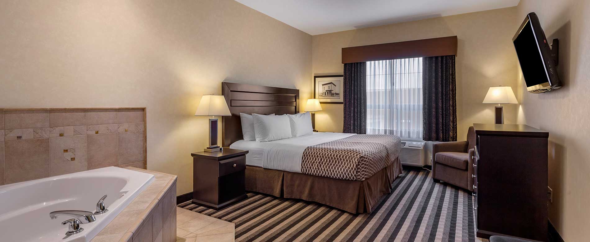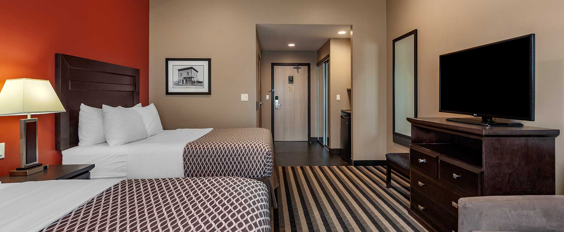 This large, well-appointed suite features two separate bedrooms, each furnished with one queen bed and 42" TV. The kitchenette area has a cooktop, microwave, mini-fridge, Keurig coffee machine, toaster, kettle, cookware and dishes.